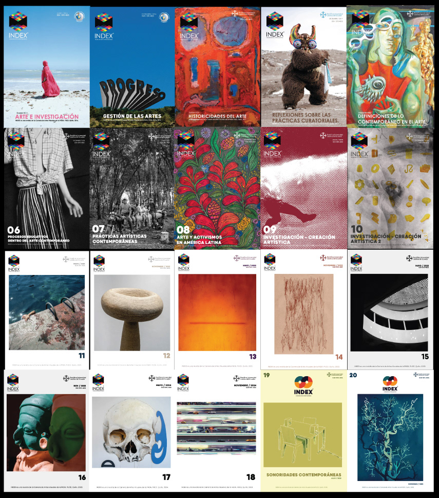ÍNDEX is an academic journal of the Visual Arts Program at the Pontificia Universidad Católica del Ecuador (PUCE), dedicated to disseminating critical research and research-creation in the field of contemporary art, with a focus on knowledge production situated in Latin America. The journal is addressed to academic and artistic communities, as well as a broader audience interested in engaging with the debates, methods, and tensions that shape artistic practice, theory, and visual culture today.